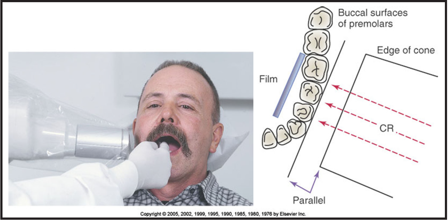 Patient positioning and receptor placement: Use a type 4 receptor. With the tube side of the receptor toward the mandible, the receptor is placed in the patient's mouth crosswise like a cracker. The receptor plane should be parallel to the floor, and the receptor should be pushed posteriorly as far as possible. The lateral border of the receptor should be positioned parallel to the buccal surfaces of the posterior teeth and extend laterally approximately one-half inch past the buccal cusps on the side of interest. The patient's head is then rotated to the side and lifted up. Before any radiographic images are exposed, the patient must be draped with a protective apron and thyroid collar. The apron must be properly placed to avoid interference with the radiographic exposure.