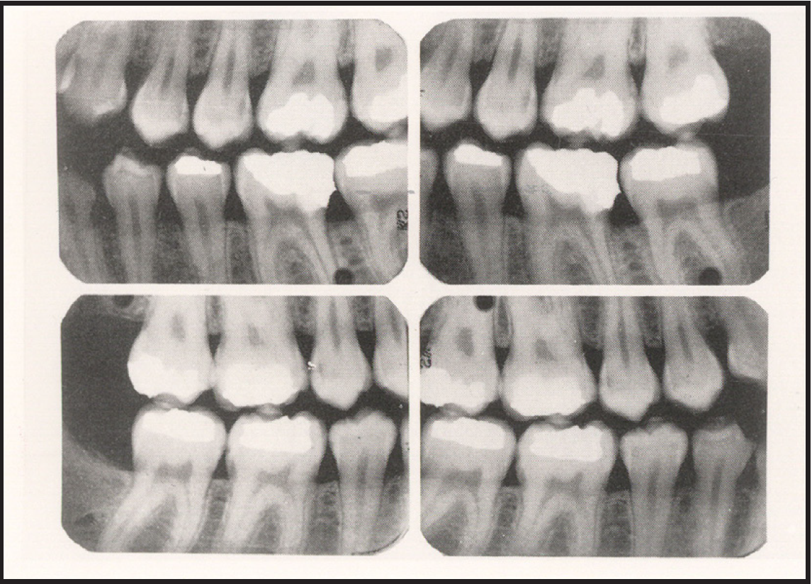 When using type 3 receptors, only one longer bitewing is used on each side. Opening both the premolar and molar contacts on one radiographic image can be very difficult (Figure 5). With the use of type 2 receptors for bitewings, the operator uses a total of four images. Each image is assigned either premolars or molars (Figure 6). Use of the type 2 instead of type 3 radiographic receptors for bitewings is not only more comfortable for the patient but is easier for the operator to open the contacts.