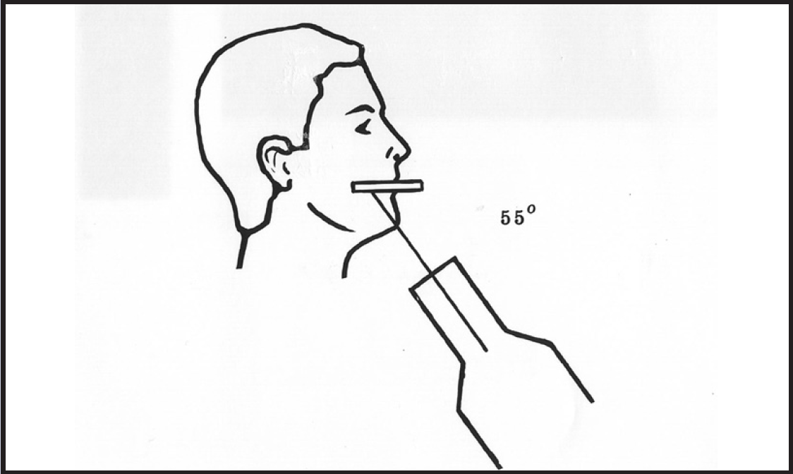 Receptor placement: Use a type 4 receptor. With the tube side of the receptor toward the maxilla, the receptor is placed crosswise in the mouth, like a cracker. It is gently pushed backwards until it contacts the anterior border of the mandibular ramus. The patient bites down gently to maintain position.