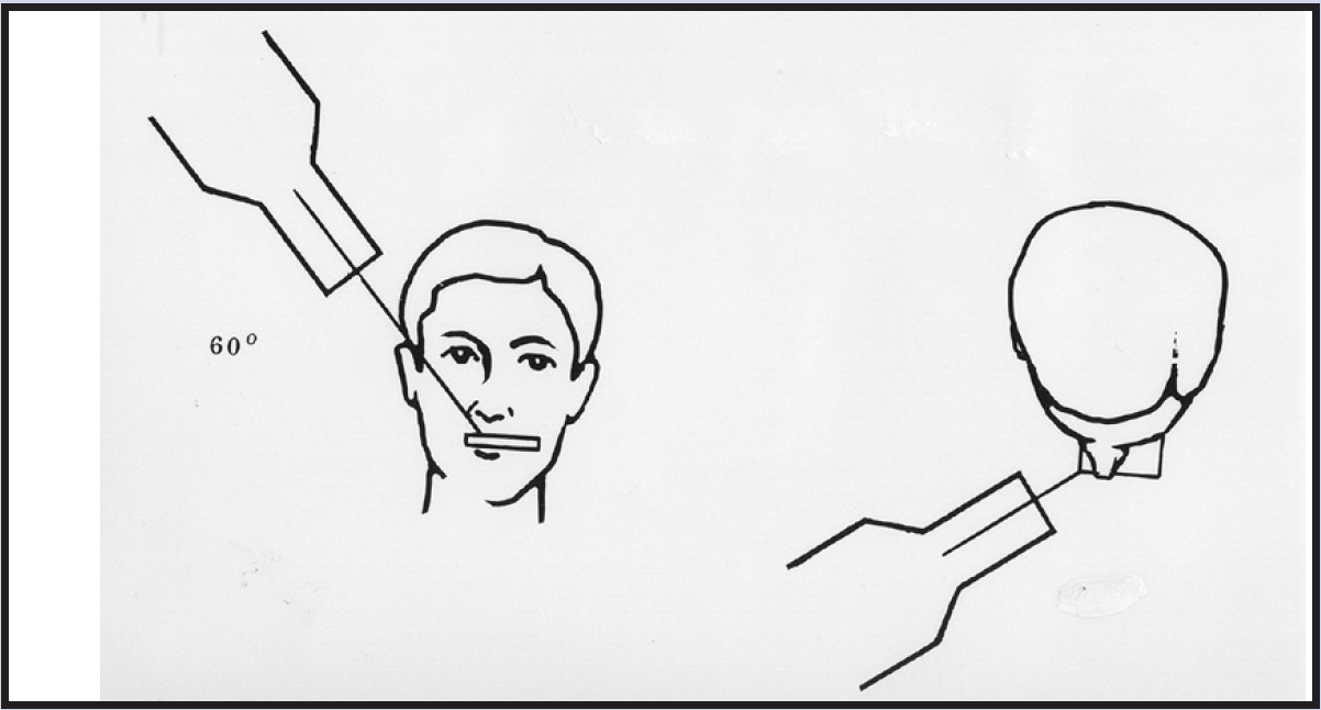 Direction of the central ray: The central ray is directed at the center of the receptor with a vertical angulation of +65 degrees and a horizontal angulation of 0 degrees. In this case, the central ray will pass through the bridge of the nose, as in Figure 65.