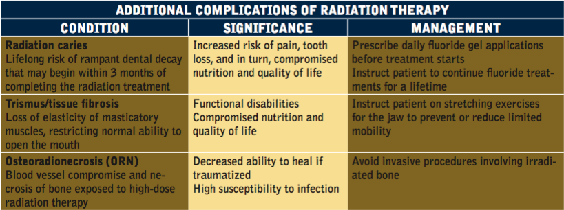 Once the patient has completed head and neck radiation therapy and acute oral complications have abated, evaluate the patient regularly (every 4 to 8 weeks, for example) for the first 6 months. Thereafter, determine a recare schedule based on the needs of the individual. Keep in mind that oral complications can continue or emerge long after radiation therapy has ended. Patients receiving radiation therapy need to know about its risks: