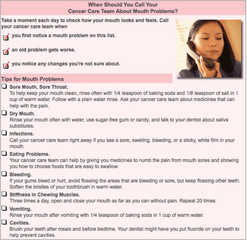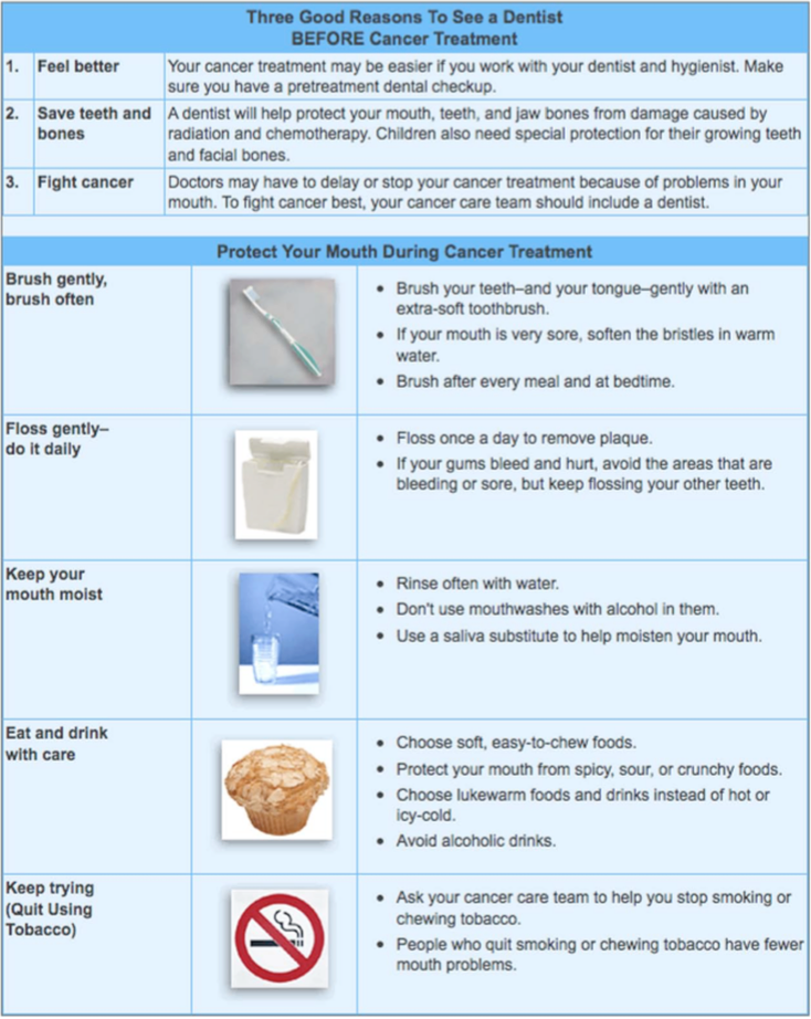 National Institute of Dental and Craniofacial Research. (2009, September 1). Oral health, cancer care, and you. Retrieved from www.nidcr.nih.gov