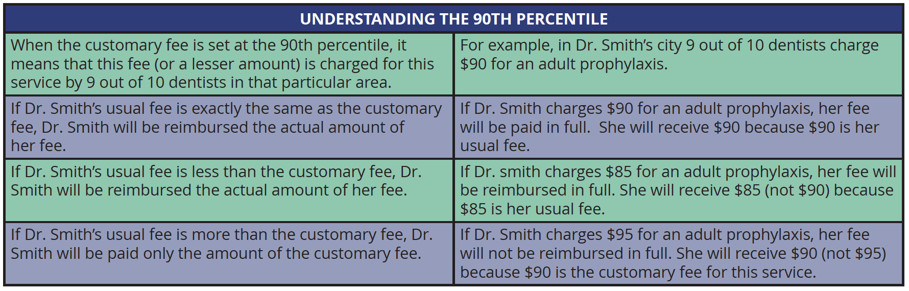 The accounting process begins when the patient leaves the treatment area. Fees charged for services provided are done so according to a fee schedule, defining what patients are charged for each particular service. The fee schedule is referred to as the usual, reasonable and customary fee. The usual fee refers to the fee typically charged by the dentist for a specific treatment procedure. The reasonable fee is the midrange of fees charged for the same procedure; if the case was particularly difficult, then the usual fee may be raised to reflect the degree of difficulty. The customary fee is the average, up to the ninetieth percentile, that dentists in the area charge for the same procedure. This type of fee schedule allows for some flexibility on the part of the dental practice. If he or she wishes to charge more for a particular procedure, the insurance companies utilizing "fee-for service plans" will not pay above the usual, reasonable and customary fee schedule. Patients are then billed for any charges not covered by the insurance company and may become upset if fees were not previously discussed in the treatment plan or at the consultation appointment. Most dentists choose to stay within the fee schedule range. This range can be adjusted yearly, if need be, by raising fees three to five percent for area dentists, in order to cover the rising costs of dentistry.