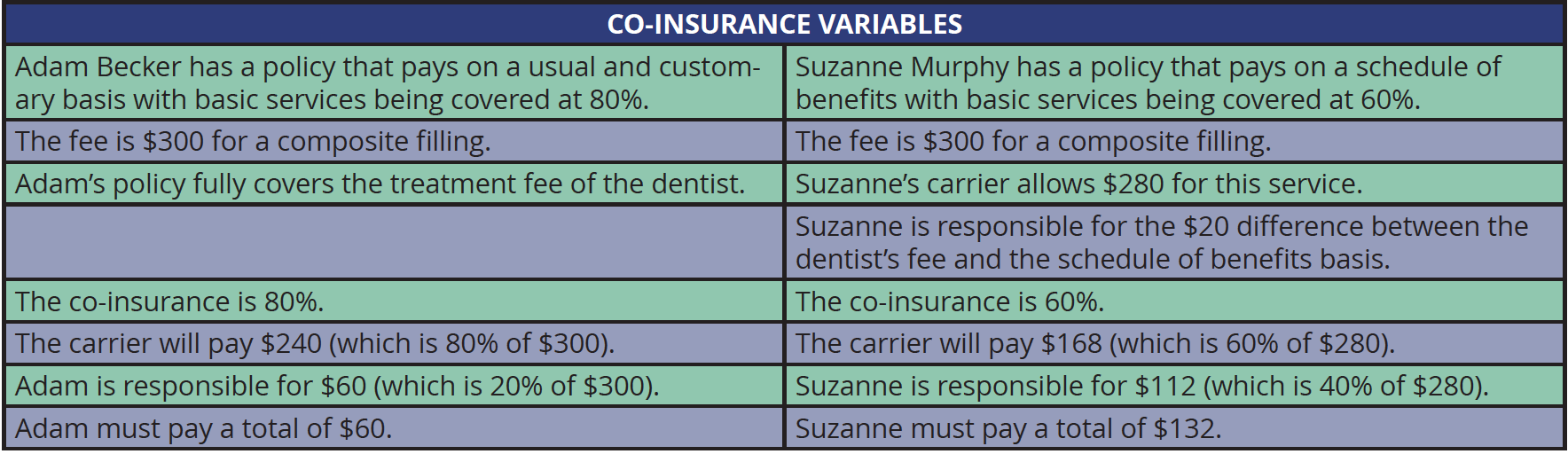 Another area that impacts many dental practices, in which dentists make adjustments, is dental insurance. Dentists who accept assignments in specific insurance programs agree to accept a payment in full by the provider. If a dentist treats a patient on a particular program with whom he or she is participating, and the insurance company reimburses at $80 for treatment that was billed at $100, the dentist must write off or adjust the remaining $20. The patient is not responsible for the remaining $20 because the dentist is a provider for that particular insurance plan. The dental team must be made aware that a practice cannot survive if the dentist was a participating provider for all insurance companies. The adjustments would quickly outweigh profitability. Dental insurance is covered more thoroughly under third party payments.