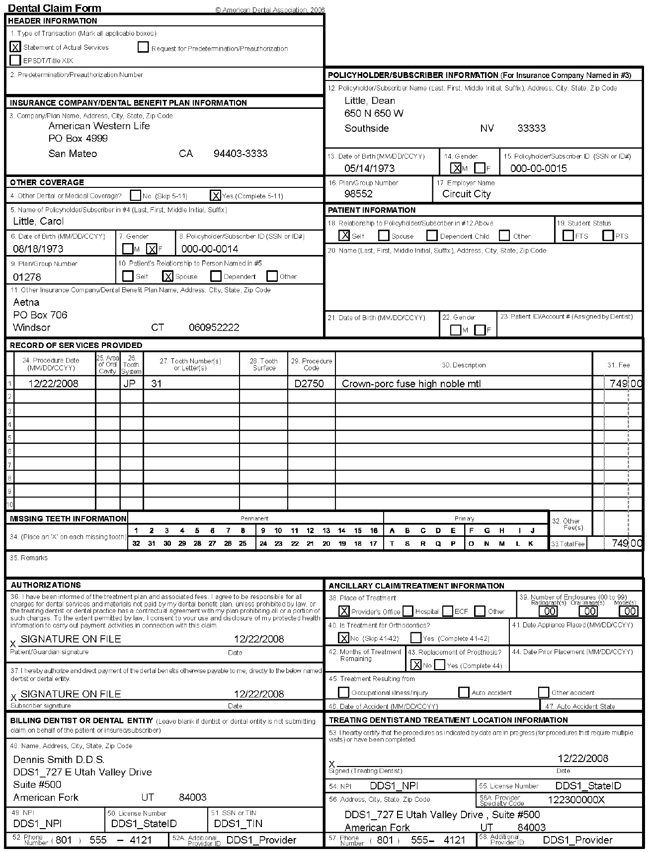 Attending Dentist's Statement - also known as the ADA Dental Claim Form, used to report dental procedures to a third-party payer for reimbursement.