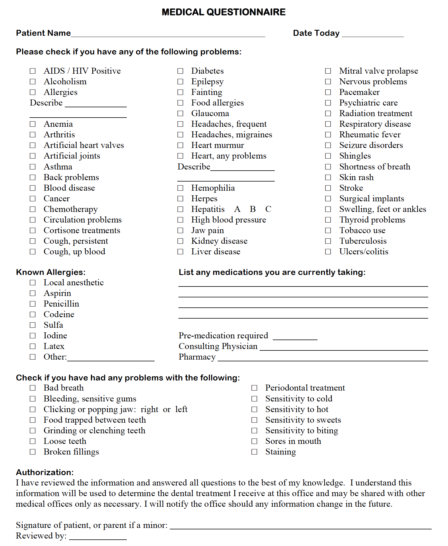 1. A current medical history questionnaire/form that is signed and dated by the patient and dentist.