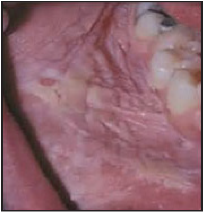 Squamous cell carcinoma is a malignant neoplasm that exhibits squamous differentiation characterized by the formation of keratin or the presence of intercellular bridges.30 Intraoral lesions are white and wrinkled in appearance with intermittent red lesions.