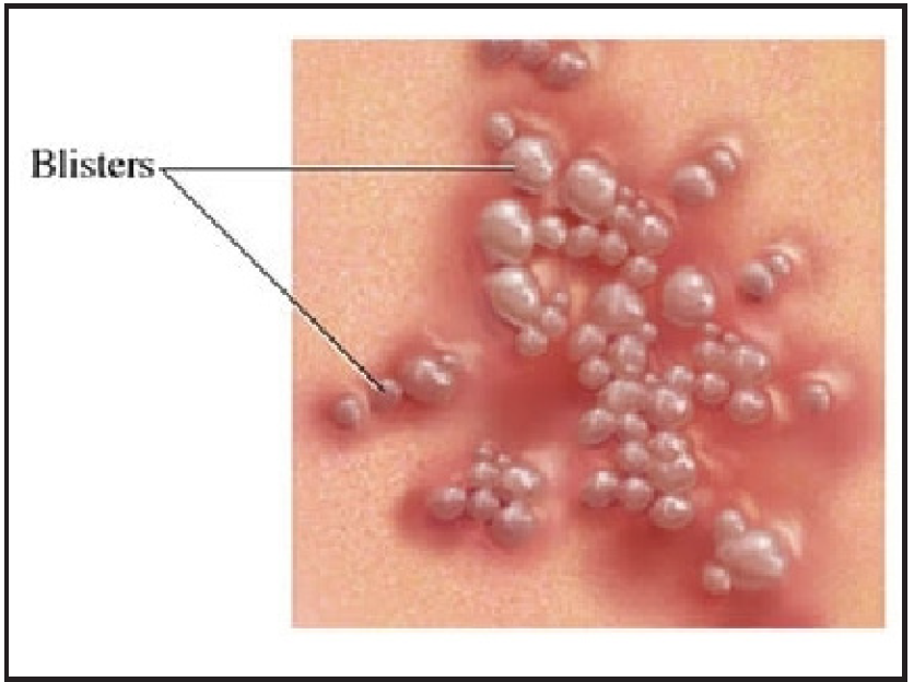 "Fever blisters" and "cold sores" (Figure 4) are the most common presentations of HSV-1. Lesions occur on the lips and start as small grouped vesicles on a red base, progressing to ulcerated areas that heal without scarring. Lesions crust-over in four-to-five days and heal in about 10 days. Approximately 40% of patients infected with HSV-1 experience a recurrence.