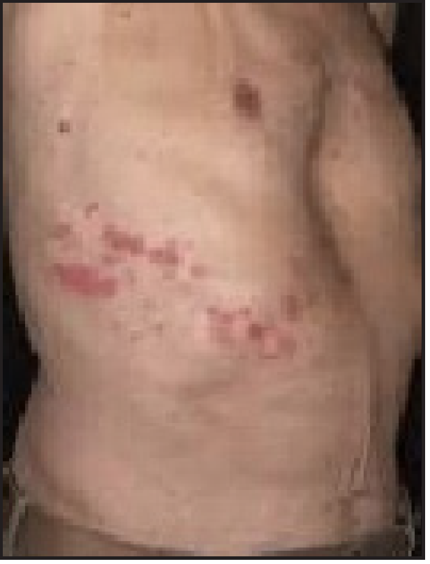 After chickenpox resolves, the virus is thought to remain latent in the dorsal root or cranial ganglion. In 90% of herpes zoster (HZ) cases, reactivation is presaged by pain and cutaneous sensitivity along a dermatome, usually thoracic. (Figure 6) Three-or-four days later, the lesions erupt. Over the course of several days, groups of vesicles on a red base develop along the dermatome. The vesicles then become pustular as white blood cells infiltrate to kill the virus. The pain of shingles can be severe. The principal complication of shingles is postherpetic neuralgia (PHN); the pain continues and can increase as time passes, even after the lesions have healed. A pain management specialist may have to be consulted for the treatment of PHN.