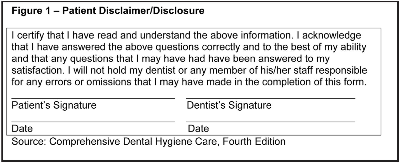 At the end of the health history written questionnaire the patient should be required to sign a statement that serves as a disclosure that the information is complete and accurate and also a disclaimer that the patient does not hold the dentist or other team members responsible for any errors or omission of information they may have made in completing their form. A sample statement is illustrated in Figure 1.