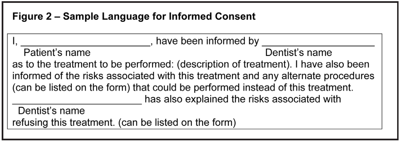 In many cases, informed consent is implied. In other words, the fact that a patient makes an appointment and allows a dentist, assistant, or hygienist to treat him/her, implies that they gave consent for treatment. Attorneys and risk management specialists, however, recommend that informed consent be in written form (Figure 2). This consent form can be attached to or incorporated into the health history form. Many times, specialists, such as endodontists, oral surgeons, periodontists and orthodontists utilize specialized consent forms that detail the possible risks of the specific procedures that they perform. The only instance where a patient or guardian is not legally required to give informed consent, is when the patient is unconscious and in need of emergency treatment. For example, if a patient is having an allergic reaction to latex, you do not need to have them sign a consent form to administer epinephrine to help save them from anaphylaxis and possible death.