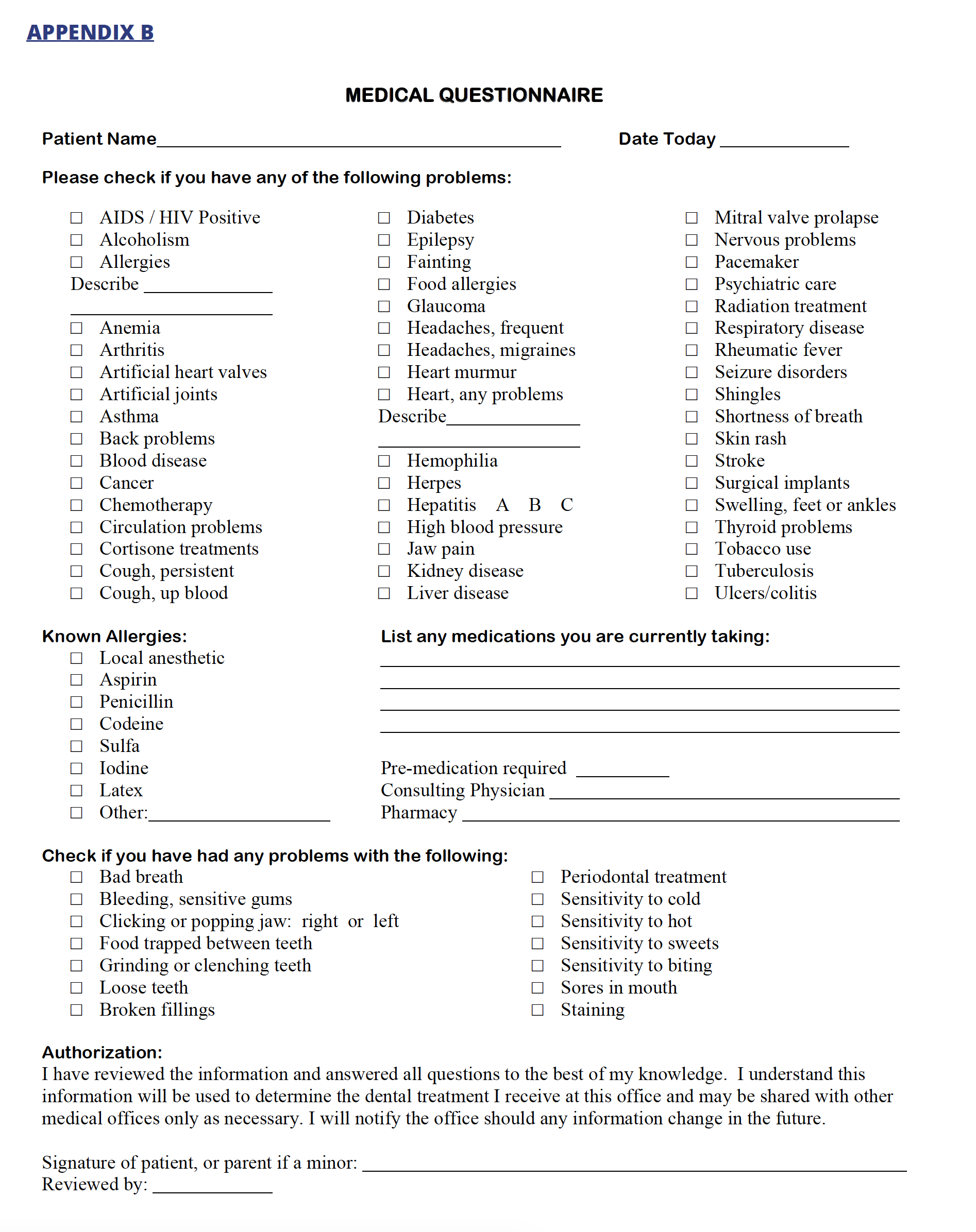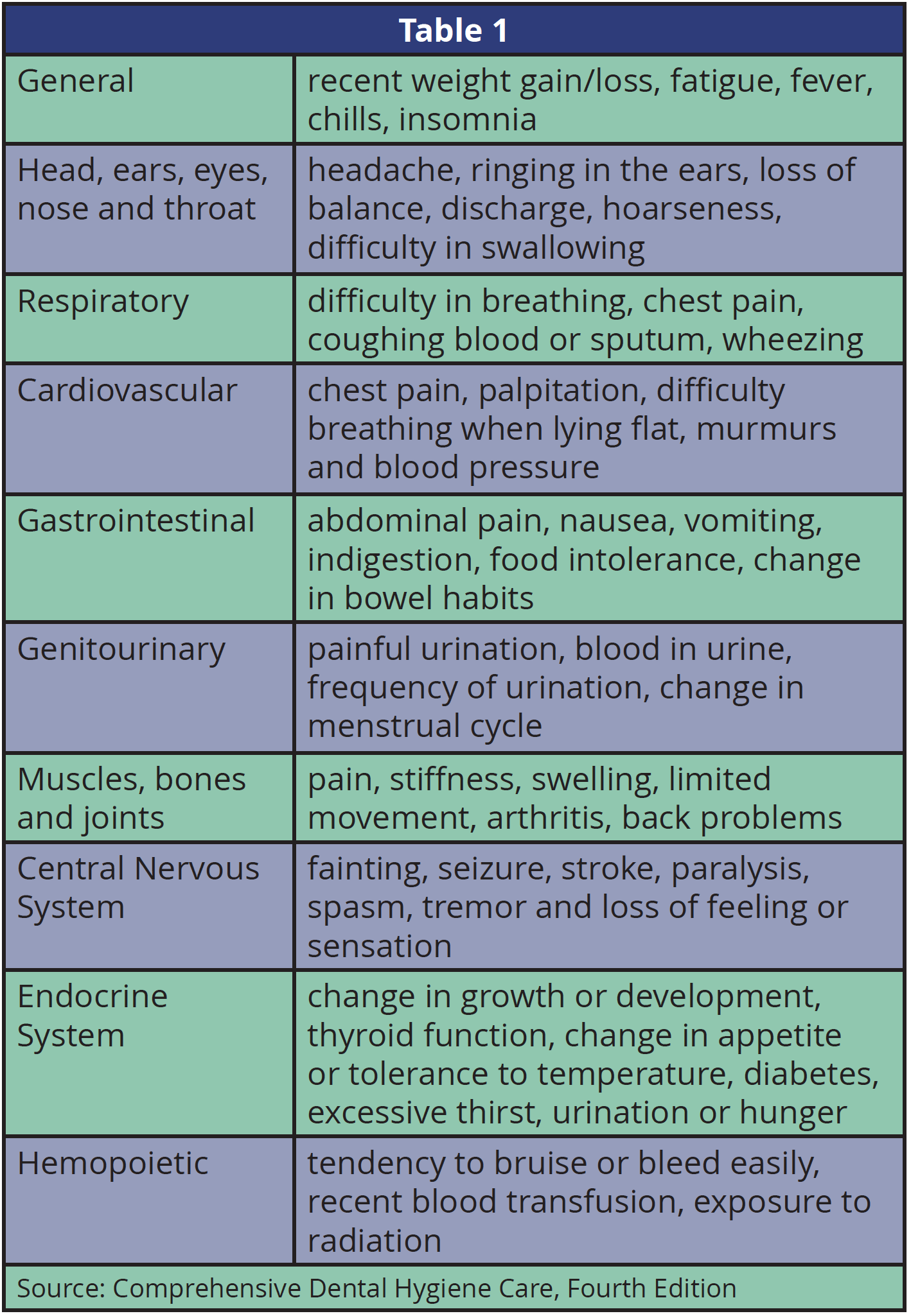 The medical information necessary on a health history form will be the lengthiest and most time-consuming for the patient and dental team to complete. It should include the patient's past history including, for example, whether they have had a previous heart attack; their family history (does anyone in their family have cardiovascular disease?); and a list of all medications the patient is currently taking, including over the counter (OTC) medications, like antihistamines, antacids or nutritional supplements. Recent surgeries and treatments such as chemotherapy or radiation should be noted as the patient may be immuno-compromised and unable to receive treatment. The last component of the medical history is a review of all the body systems, to determine if there are any conditions that may affect, modify or delay treatment. Table 1 is an example of a review of the body systems. See Appendix B for an example of a Medical Questionnaire.