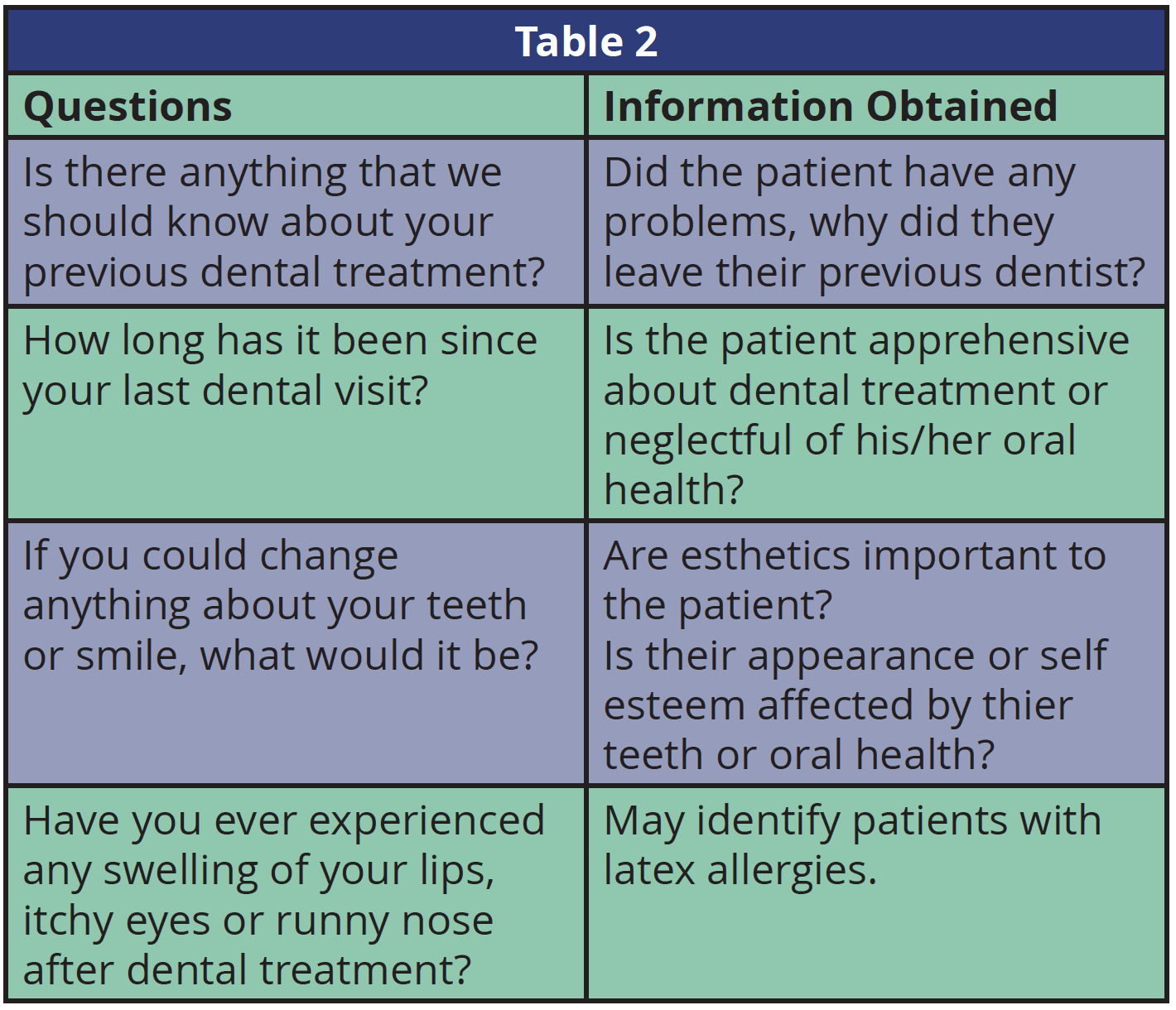 Past History. The health history should contain questions regarding the patient's past dental experiences. Table 2 lists some suggested questions to ask patients about their past dental history. If the patient has indicated who his/her previous dentist was, this information may be verified by contacting that dentist.