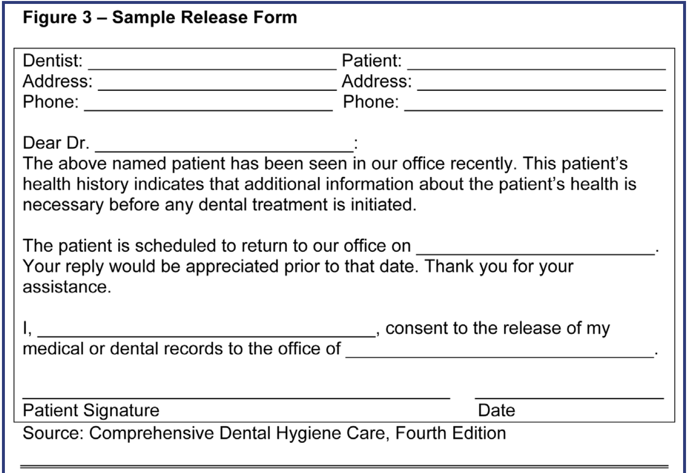 Due to the confidentiality of medical information and the physician-patient relationship, all requests for medical consultation information on patients should be made in writing, with the patient's signature authorizing the release of the information. Figure 3 is a sample release form. In some cases, the release form may be sent to the physician with the patient or through the mail. In other cases, to save time, the form may be sent by fax and returned in this manner. This electronic transmission of protected health information is covered by HIPAA and the dental practice must have a one-time signed consent form signed by the patient for the transmission of this information, in addition to the release that must be signed for the physician to release the information to the dental practice.