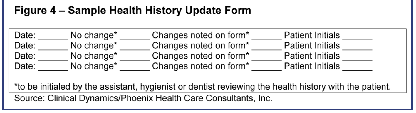 Each time a patient visits the dental office for treatment, the health history should be updated. If it has been a relatively short time since the patient was seen in the office (weeks or months) the health history can be updated verbally, by asking if there have been any changes and if the patient is taking any new or different medications. Once this information is obtained, the patient must initial and date the health history form, to validate the updated information. The dental team member who updates the information should also initial the updates. A common method for facilitating this update is to create a section on the health history form with blank lines for initials and dates (Figure 4).