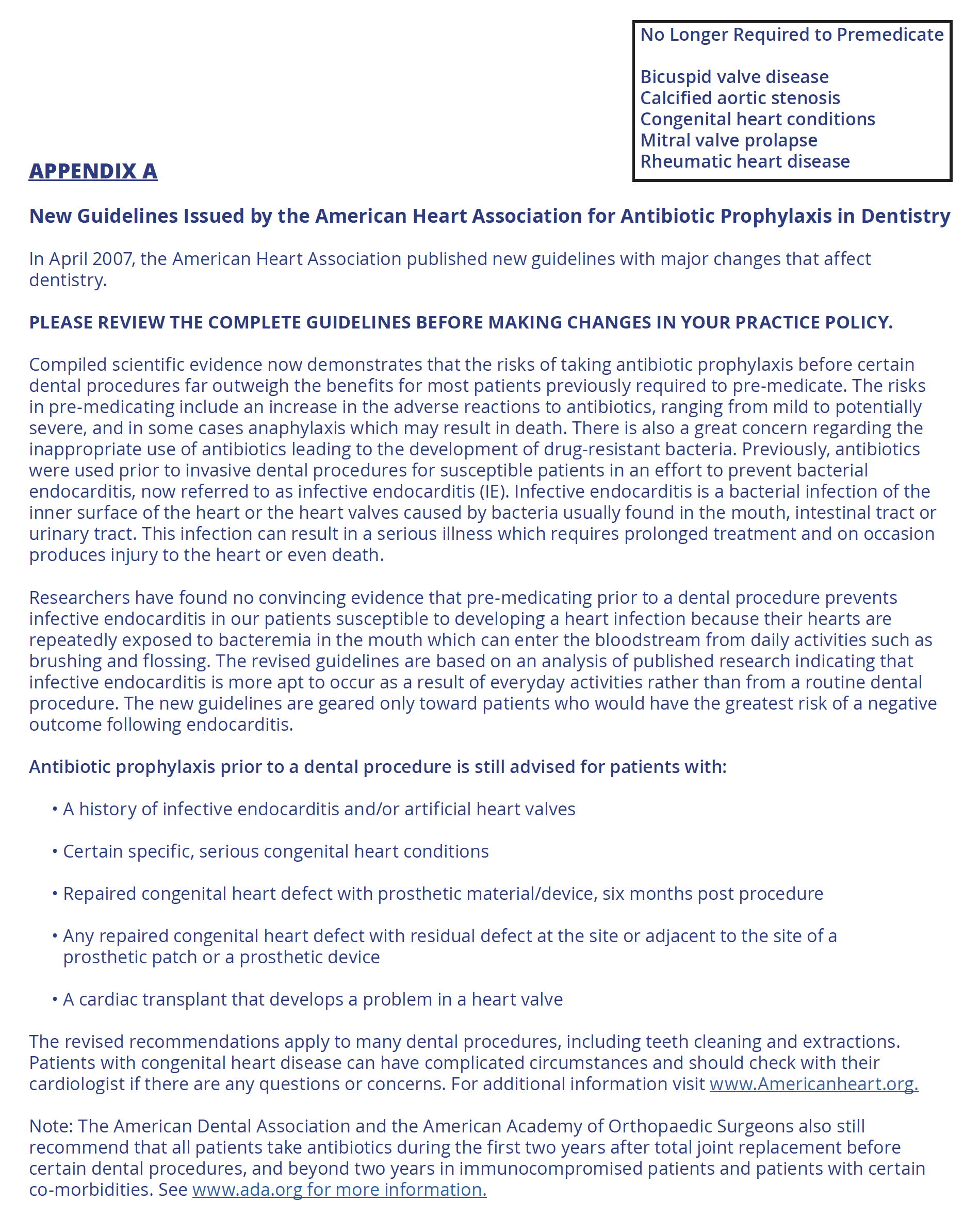 Need for Antibiotic Prophylaxis. The American Heart Association (AHA) guidelines from April, 2007 are those currently used to determine the need for and the protocol for antibiotic prophylaxis. The AHA, in conjunction with the American Medical Association and the American Dental Association, reviewed and revised the type of patients that need to be pre-medicated for dental treatment. Each office should consult with the patient's physician if unsure of recommended antibiotic prophylaxis prescriptions.