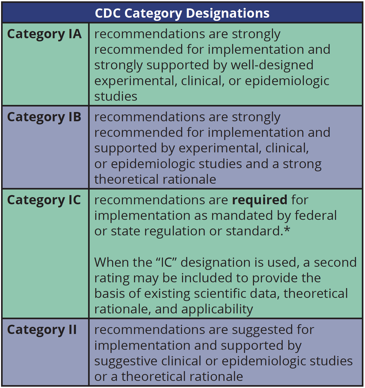 Each recommendation in the 2003 document is categorized on the basis of existing scientific data, theoretical rationale, and applicability. The CDC category designations, as described below, accompany each recommendation cited in this course.