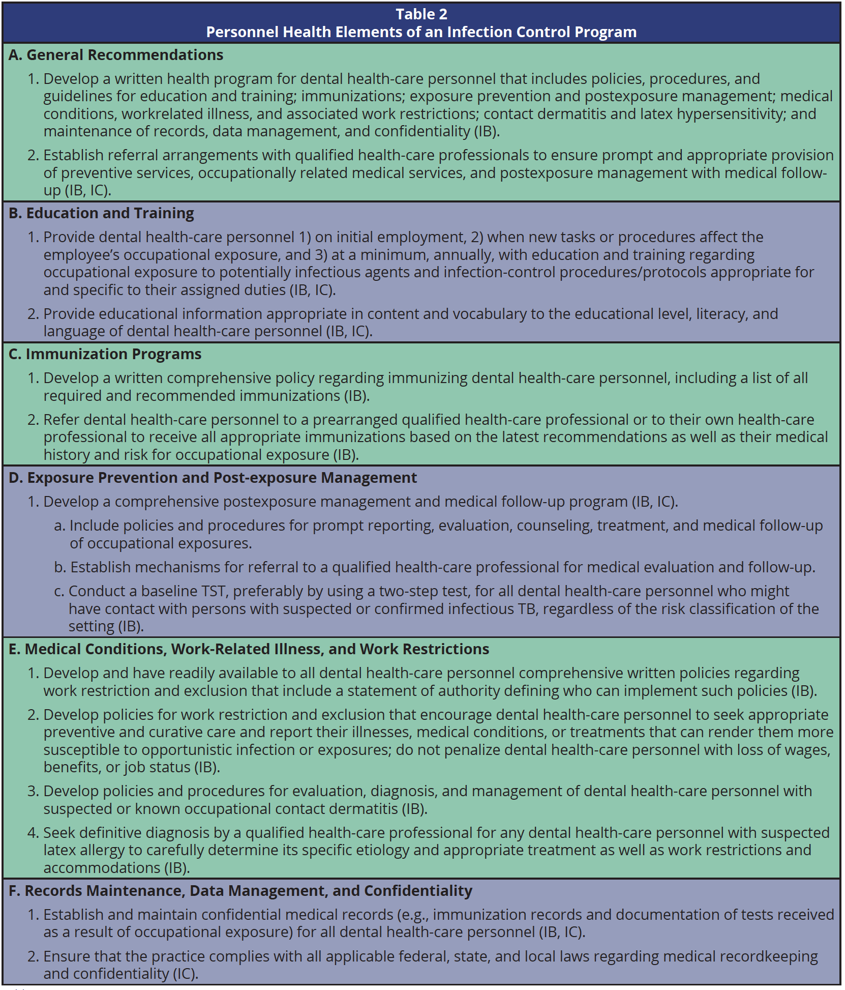 CDC's administrative recommendations for personnel health elements of an infection control program are listed in Table 2.