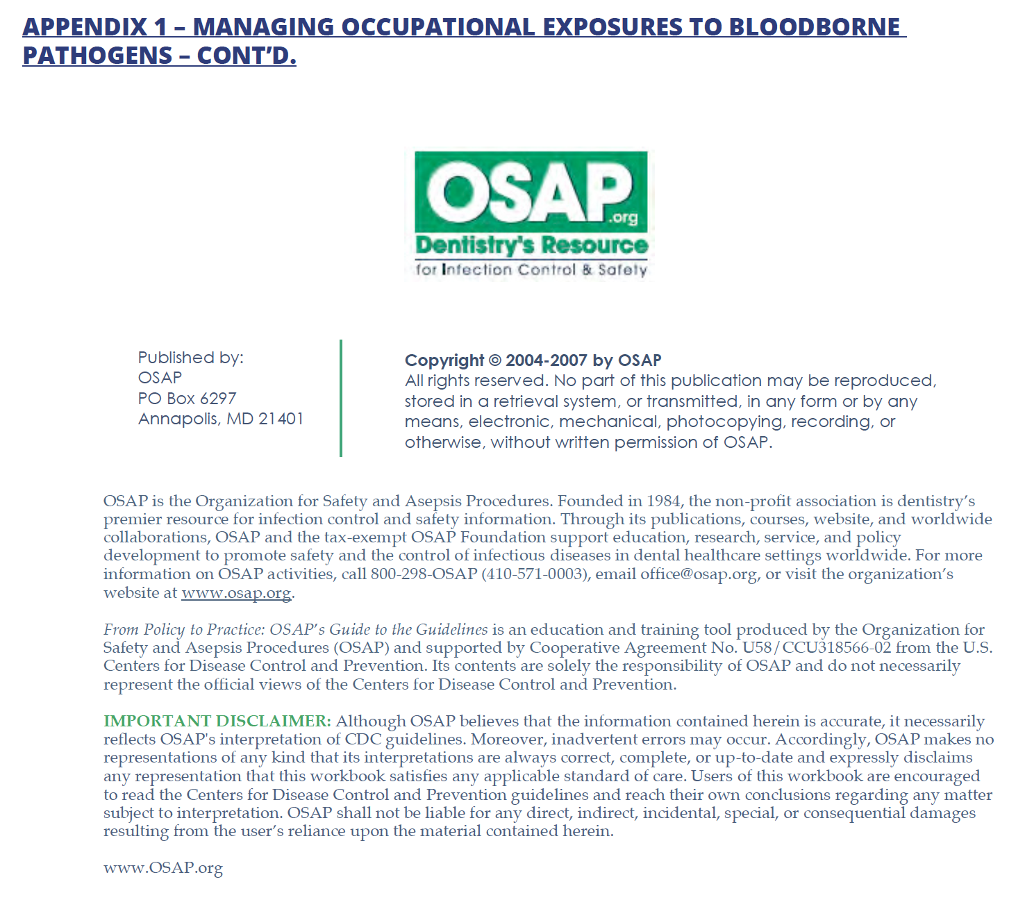 Ortolano K, Organization for Safety and Asepsis Procedures. From Policy to Practice: OSAP's Guide to the Guidelines. Annapolis: OSAP, 2004.