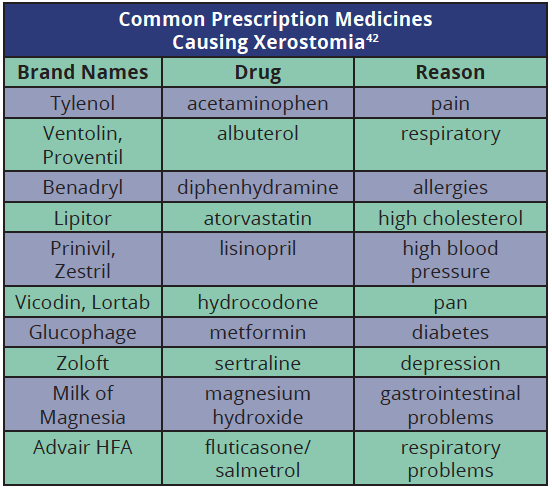 Xerostomia is the most common oral side effect caused by medications. There are more than 400 pharmaceuticals that list xerostomia as a side effect (see Table 1 for common medicines).5,6,39,42 The salivary glands are stimulated strongly by cholinergic agents, drugs that stimulate nerve impulses. Therefore, anti-cholinergic medications, such as antihistamines and drugs that treat Parkinson's disease to reduce uncontrolled nerve stimulation are more likely to cause decreased salivary output and xerostomia.5,41 However, many other classes of medications, including sedatives, antipsychotics, antihypertensives, antidepressants, respiratory inhalers, and diuretics are associated with xerostomia.39 Interestingly, many herbal preparations may induce complaints of oral dryness, and patients should always be questioned about non-prescription drug use.7 Examples of commonly used preparations include members of the Labiatae family (specifically all the salvias), capsicum, garlic, Ginkgo biloba, and St. John's Wort (Hypercicum perforatum). Herbal preparations with strong diuretic properties, such as stinging nettle (Urtica dioica) and dandelion (Taraxacum officinale) also may lead to complaints of dry mouth. Caffeine is well recognized as a cause of xerostomia.8 As many as 25 million persons in the United States may experience xerostomia as a result of medication use.