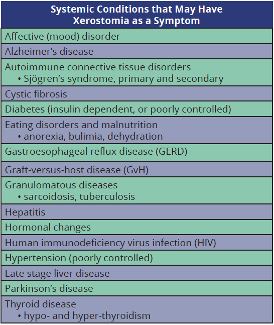 Xerostomia is one of the hallmark symptoms in Sjögren's syndrome, experienced by over 95 percent of patients. The condition is known to progress slowly over time so that most diagnoses are recognized when a person is in their forties to fifties.43 Patients experience a number of dryness complaints in addition to xerostomia. These include eye, nose, throat, skin and vaginal dryness. Since complaints of oral dryness typically do not appear until salivary function has been reduced by approximately 50 percent, more than a single gland must be affected for xerostomia to manifest.15 This emphasizes that dryness resulting from salivary dysfunction is usually indicative of systemic involvement. Table 2 provides a fuller listing of systemic conditions with xerostomia as a possible symptom.