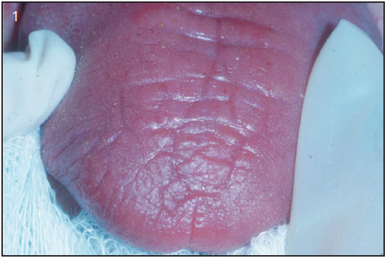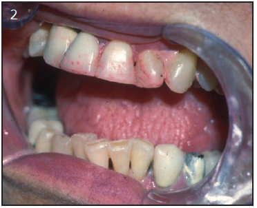 On examination, the patient with xerostomia due to reduced salivary gland function usually has obvious signs of mucosal dryness.1 The lips may be cracked, peeling and atrophic; the buccal mucosa pale and corrugated in appearance; and the tongue smooth and reddened with loss of papillation (Figure 1). The oral mucosa may appear reddened, thinner and more fragile. The patient may show signs of oral ulcerations, angular cheilitis, or complain of a burning sensation in their mouth and tongue known as stomatodyna.39 There is often a marked increase in erosion and dental caries, particularly at the gingival margin, and even cusp tip involvement. The decay may be rapid and progressive even in the presence of excellent oral hygiene (Figure 2). One should consider whether the caries' history and current condition are consistent with the patient's oral hygiene. Candidiasis, most frequently of the erythematous form, is frequent and may contribute to mucosal sensitivity (Figure 3). The salivary glands should be palpated for enlargement, changes in texture, sensation of pain, and also to determine if saliva can be expressed from the main excretory ducts. The saliva should be clear, watery and copious. A cloudy exudate may be a sign of bacterial infection, although some patients with very low salivary output will have opaque secretions that are sterile. After receiving radiation, saliva turns yellowish-brown in color, is thicker, and results in a more acidic pH.41
