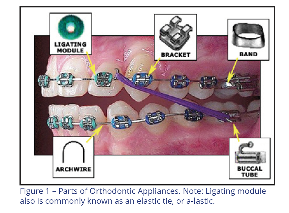 or correct their positions. In traditional orthodontics, small orthodontic appliances, known as brackets, are connected to exterior surfaces of the patient's teeth, and an archwire is placed in a slot of each bracket to move the teeth. The archwire forms a track that guides movement of the teeth to the desired positions for correct occlusion. End sections of the archwire are placed through appliances known as buccal tubes. The buccal tubes are either bonded or welded to bands and cemented onto the patient's molar teeth (Figure 1).
