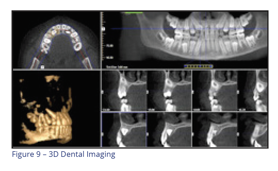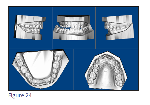 Cone beam 3D dental imaging is becoming more popular to gather information needed to evaluate and diagnose a case. 3D views are used to analyze teeth, roots, TMJ, airway, and sinuses without magnification or distortion. Practice efficiency can be enhanced by capturing a complete workup in less than 10 seconds. This is especially helpful when the practitioner intends to place TADs or when knowing the exact position of teeth is important to determine the best treatment plan. A virtual study model can be utilized to prevent the need for taking study model impressions (Figure 9).