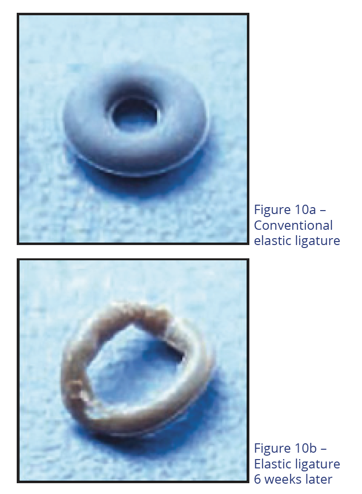 Full engagement is a feature of self-ligation. The bracket's clip/slide is either fully shut or it is not; unintentional partial engagement is not possible. Because no elastic ligature is required, ligature decay (Figure 10a and 10b) also is not a problem. However, security of ligation depends on the clip/slide being robust and not inadvertently opening. Until very recently, this requirement for security of performance was not fully met by self-ligation designs. Secure, full-archwire engagement maximizes the potential long range of action of modern wires and minimizes the need to regain control of teeth when full engagement is lost during treatment.