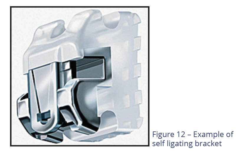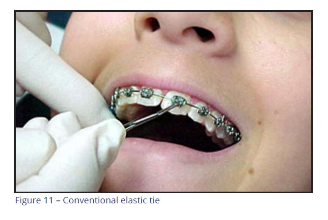 at the bracket-archwire interface tends to impede the desired movement. The method of ligation is an important contributor to this frictional force. Traditionally, elastic ties have been used to secure the archwire into the slot (Figure 11), which created significant friction. The friction generated by a self-ligating bracket is dramatically lower than for elastomeric rings with conventional brackets. This seems to be an inherent characteristic of self-ligating brackets.
