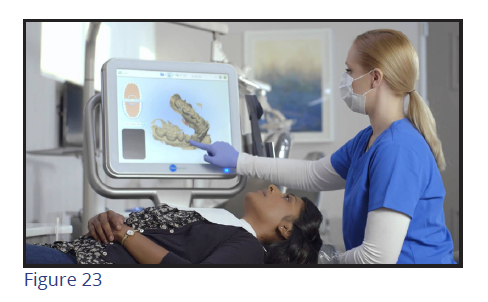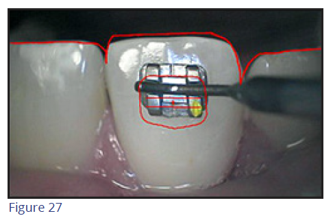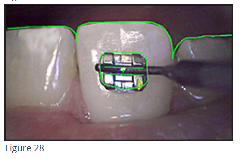 To enhance the accuracy of bracket placement, a company has designed a bracket placement wand that includes a miniature video camera. The camera transmits real-time images from the patient's mouth to the screen (Figure 27), and when the software detects a match between the projected image and the clinician-prescribed position (Figure 28), an audio-visual signal is delivered so the doctor can accurately bond the appliance.