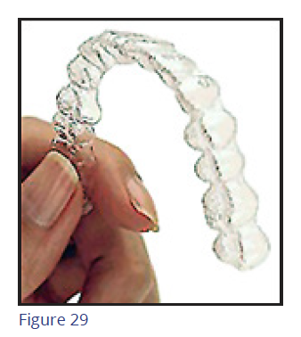 Sequential Plastic Aligners (Figure 29) are a series of clear, precision polymer aligners that incrementally straighten teeth. At each stage, tooth movement is controlled and predetermined for that particular stage. The number of aligners vary depending on the complexity of the treatment and doctor preference and orthodontic goals. Aligners were first introduced to the profession in the late 1990's by Align Technology, Inc. (San Jose, CA) and are still the largest company providing clear aligners. Align Technology also developed advanced 3D tools to simulate tooth movement in progressive stages of correction, along with iTero, a 3D intraoral scanner. This allowed for a seamless system to communicate with the company in order to efficiently fabricate the aligners. However, expiring patents now allow other companies to compete with Invisalign in this orthodontic market. Due to competition, marketing and increased patient interest, aligner therapy is becoming a popular mode of orthodontic treatment.