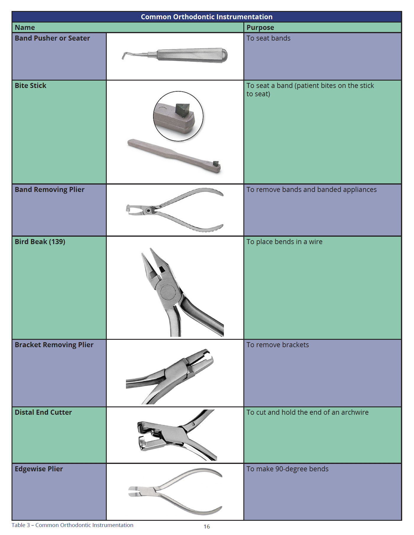 As with any dental specialty, orthodontics has a series of instruments that makes delivery easier. Table 3 describes common orthodontic instrumentation.