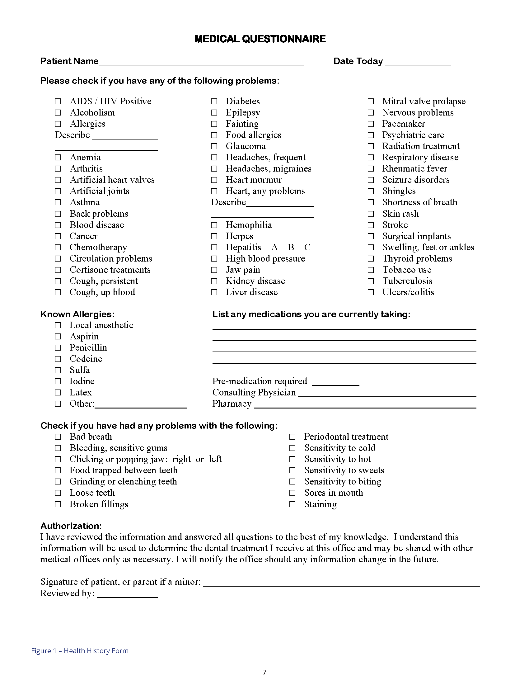 1. A current medical history questionnaire/form that is signed and dated by the patient and dentist.