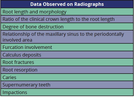 Radiographs provide clinical evidence and data that will determine the treatment for the patient and affect the outcomes of the disease. The data that can be observed on radiographs is denoted on Table 2.