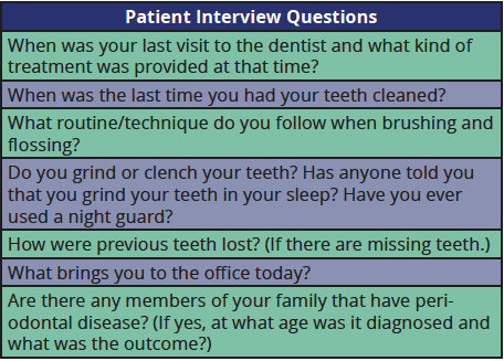 The patient interview is the first step. It is the most important step in gaining the patient's confidence and trust and is also the best source of data gathering available. Asking open-ended questions and listening carefully to the patient's answers provides information needed to assess a possible periodontal problem. Patients with moderate stage periodontal disease often complain of "bad breath." This is frequently noticed by someone other than the patient himself or herself and may be one of the primary reasons that they requested the appointment. Some patients notice bleeding when brushing and flossing and this may be another reason that they seek dental care.