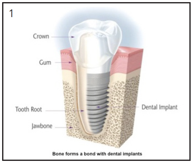 Teeth are anchored into the alveolar bone by the periodontal ligament. This ligament is a muscle attachment that acts like a shock-absorbing mechanism. Dental implants integrate directly into the alveolar bone, without a periodontal ligament.4 (Figure 1)