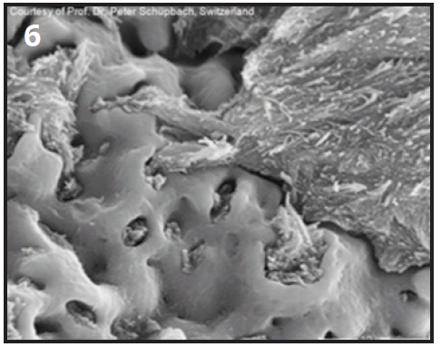 One way to increase the rate and success of osseointegration is to increase the surface area of the implant. This can be accomplished by spraying of the machined implant surface with liquid titanium or by dipping the implant in an acid that created microporosities. (Figure 5) Most of the implants available today have a surface that is porous to allow the bone cells to better attach to the implant surface.17 (Figure 6)