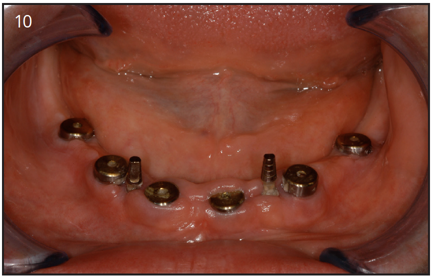 Mini-implants were introduced in dentistry as a temporary implant. These were placed to support a denture, or temporary prosthesis during the healing time following implant surgery.21,22 (Figure 10) Several manufacturers are now produce mini-implants for permanent restoration of missing teeth. The cost of mini-implants is approximately ¼ of the cost of a regular implant; however, the studies show a success rate of 60-70% during 5 years in function.