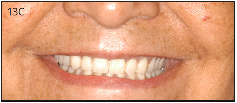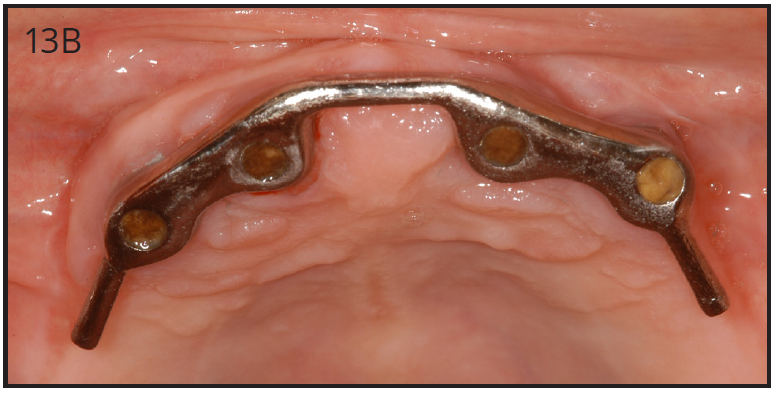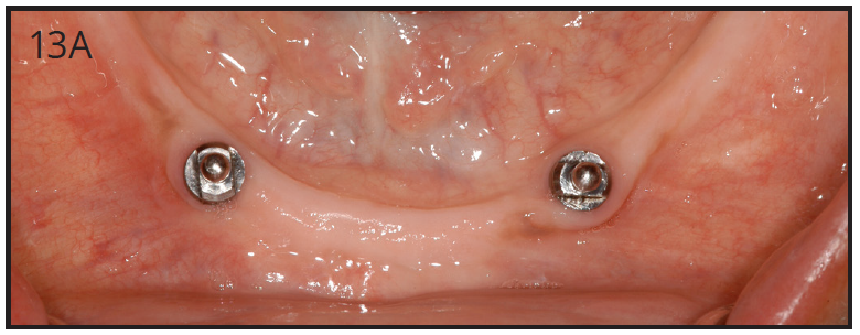 As stated earlier, dentures replace only about 10% of chewing function. This causes digestive problems, due to an inability to chew food properly, also leading to malnutrition, due to an increase in consumption of softer, more processed foods. This inability to chew also results in atrophy of the alveolar arches due to lack of adequate pressure on the bone. When the denture is pressing on the mental foramen, then patients will experience pain and numbness of the lower lip. A good solution for these denture wearers is to place 2 to 4 implants in the mandible to stabilize the denture. The denture is then attached to the implants via snap-on attachments or a bar. (Figures 13A-C) According to the 2002 McGill Consensus Statement on Overdentures, mandibular two-implant overdentures are superior to conventional dentures in all clinical trials, even up to nine years in function.32