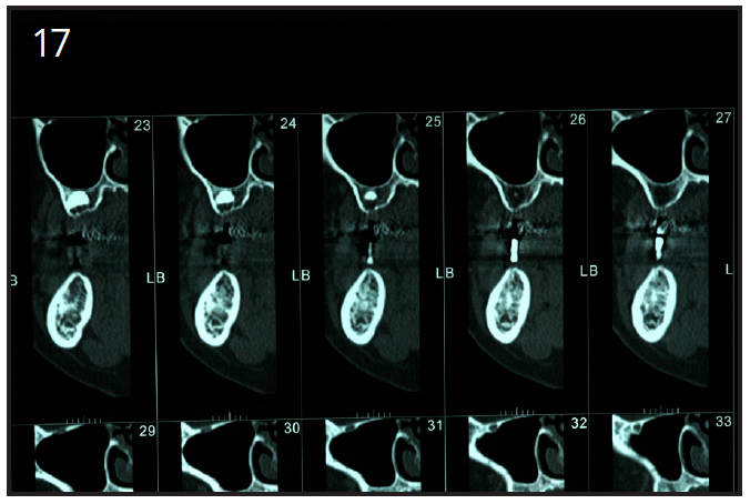 A radiographic guide may be given to the patient to wear during the jaw CT scanning procedure. This is made by the dental laboratory or in the dental office. Impressions of both arches are required to obtain mounted dental models. The correct occlusion relationship and the location of the teeth to be replaced with implants must be noted. The patient wears the radiographic guide when the CT scan is being taken. The radio-opaque markers from the radiographic guide are visualized on the CT scan, marking the position of the desired implant orientation. (Figure 17)