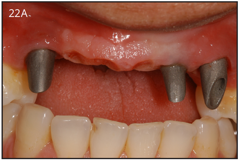 The implant prosthesis delivery appointment is similar to that of a crown and bridge. (Figure 22B) If the prosthesis is screw retained, then no cement is necessary and an occlusal filling material, such as composite, is necessary. After bite check, the patient is taught how to maintain the restoration. (Figure 22C)