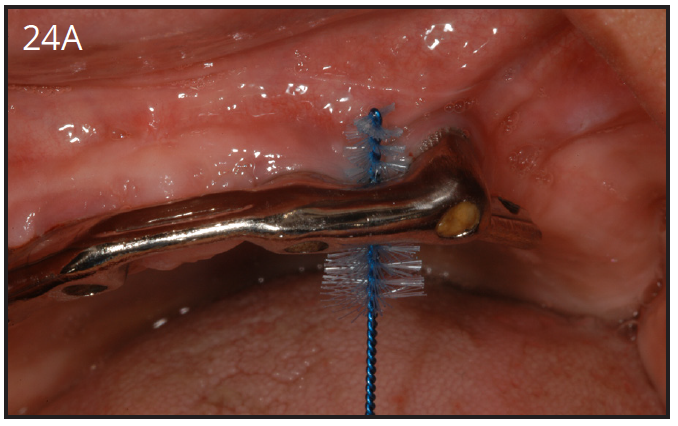 Home care for dental implant restorations is the same as for natural teeth. Daily brushing and flossing are mandatory to remove plaque build-up, which can cause peri-implant mucositis (gingivitis) and worse, peri-implantitis. Patients rely on the dental team to give them instructions on how to clean their implants. It is important to be comfortable to show the patients how to use any new oral hygiene device that the doctor may recommend. (Figure 24A)