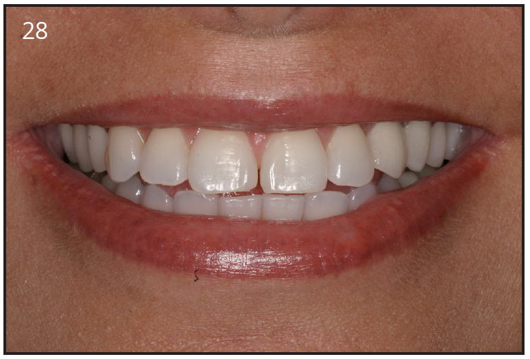 Many patients struggle with ill-fitting removable full and partial dentures. Most patients are afraid of losing their teeth because they don't want to wear a denture. But now they don't have to. Furthermore, patients can be assured that dental implants have a high rate of success with a basic home care protocol and regular dental hygiene visits. (Figure 28)