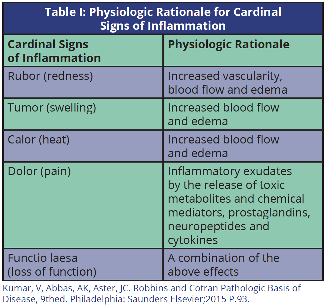 The inflammatory response consists of a vascular and a cellular reaction. These reactions are mediated by chemical factors derived from plasma proteins or cells. The classic signs of inflammation are redness, swelling, heat, pain and loss of function. The physiologic explanations for these signs appear in Table I. Other signs of inflammation include fever, leukocytosis or an increase in the number of circulating white blood cells, the presence of acute-phase proteins including C-reactive proteins (CRP), fibrinogen and serum amyloid A protein (SAA), and sepsis.