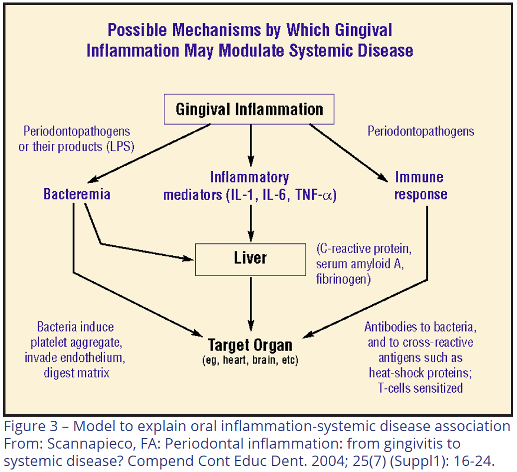 A summary of the biological mechanisms by which gingival inflammation affects systemic health appears in Figure 3.