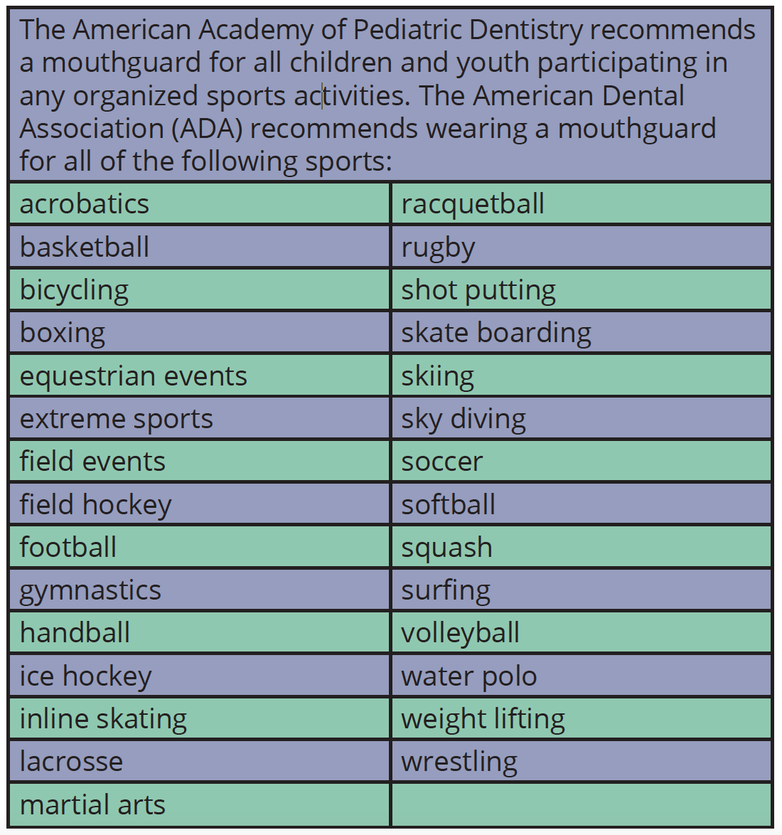 The American Academy of Pediatric Dentistry recommends a mouthguard for all children and youth participating in any organized sports activities. The American Dental Association (ADA) recommends wearing a mouthguard for all of the following sports listed in .