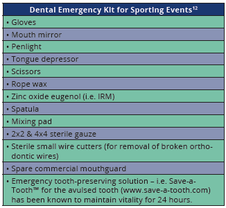 Dentists need to educate patients on the need and benefits of protective devices. The American Dental Association (www.ada.org) publishes brochures, which explain the different types of mouthguards and their advantages. The National Youth Sports Safety Foundation, a non-profit educational research organization working to promote the safety of youth in sports, has published a fact sheet on dental injuries that includes statistics, costs of injuries, resource information regarding standards for mouthguards, videos, and mouthpieces and dental care.9 A field emergency kit is a simple and inexpensive item for the dentist attending a sporting event (see Emergency kit list, ).