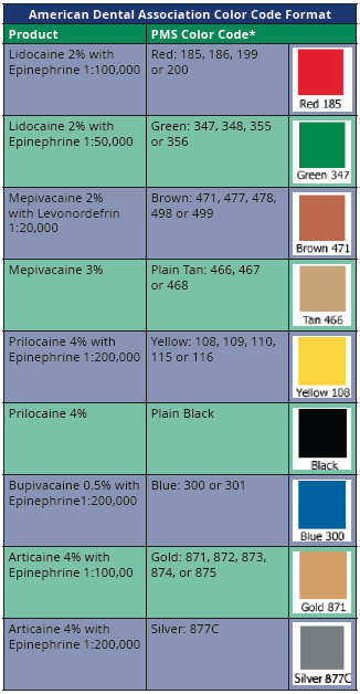 For anesthetic cartridges, colored bands can provide an added check on the type of anesthetic being used. The following color code format for banding of cartridges is used for various local anesthetics with varying amounts of epinephrine. Many dental professionals may use more than one type of anesthetic when working on different areas of the mouth. It is important for the dental professional to be aware of the color bands on anesthetics as a check on the product that is being requested in the syringe.