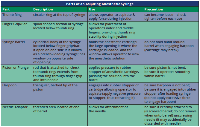 Anesthetic syringes vary in design and can be either stainless steel, which are autoclavable; or plastic, which are autoclavable or disposable. The most common type of syringe used in dentistry is the aspirating syringe. The parts of the syringe are shown in Figure 7, and their functions are discussed in Table 3. The aspirating syringe is recommended by the ADA.7 It protects the patient by allowing the clinician to check for proper placement of the needle before actually injecting the anesthetic solution. Anesthetic solutions must not be injected into the bloodstream because they can be toxic. The aspirating syringe prevents the injection of the solution into a blood vessel. The clinician will place the needle in the tissue and then apply negative (back) pressure on the thumb ring. If the needle is placed in a blood vessel, blood will be aspirated (or drawn back into) the cartridge. The clinician then knows that they must withdraw the needle and reposition it so that the solution will not be injected into a blood vessel.